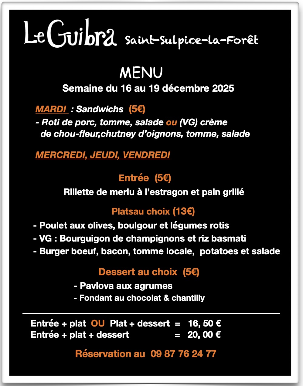 La restauration au Guibra peut se faire sur place ou à emporter. Le menu change chaque semaine.
