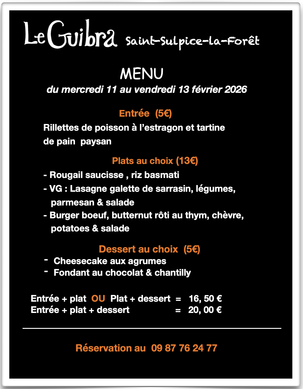 Le Guibra vous propose une cuisine savoureuse qui fait la part belle aux produits de saison, locaux et bio. Ici, nous n’avons pas peur de le dire tout est « fait maison ». Il y en a pour tous les goûts : carnivores et végétariens, cuisine trad’ ou du monde. En cas d’intolérances alimentaires, la cuistote a plus d’un tour dans ons sac, si vous en faites la demande au préalable.